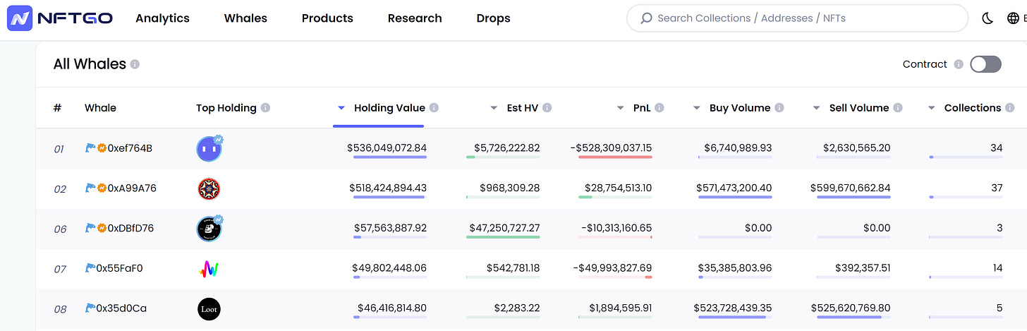 Whale Tracking - Do whales represent the “smart” money in web3? I’m not sure, but they certainly deserve paying attention to when they make a splash. Whale Tracking allows you see which NFT projects they are buying and selling, including which users are considered “whales.”