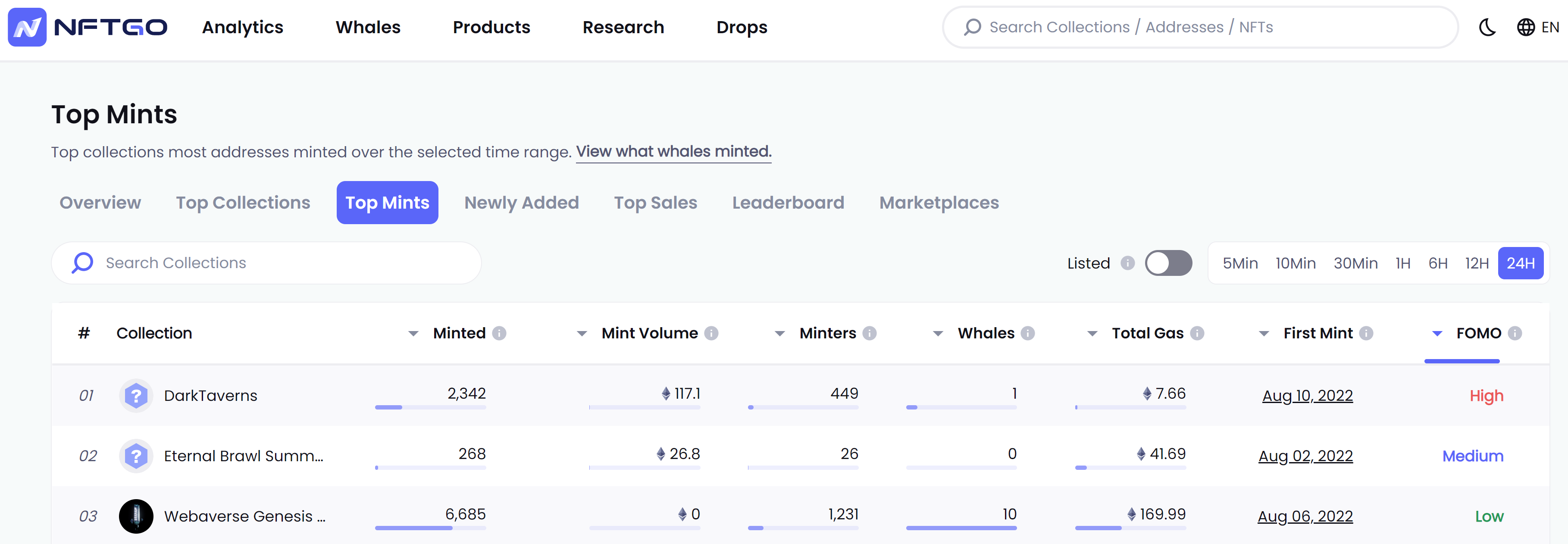 Top Mints - This is one of the best pages to visit to understand which projects are having successful mints over given time periods. You can quickly see which projects have a higher number of unique wallets minting, how many “whales” are minting, and levels of FOMO (fear of missing out tied to mint activities).