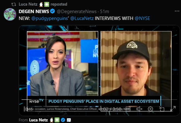 Not only is the Pudgy Penguin collection nearing its floor prices from before the PENGU drop, but they’re also continuing to dominate the Web3 narrative. Check out Luca’s interview from yesterday—it’s all about leadership, and he’s absolutely crushing it. Also, if you want to hear how Pudgy will continue to own the narrative, then watch this additional video.